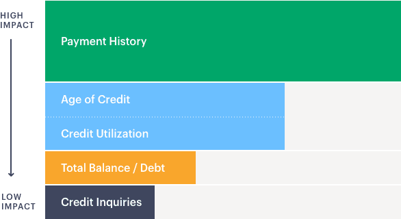 - Late payments: Late payments have the biggest impact on your credit score, so if late payments are dragging your score down it’s vital to find ways to make sure that you don’t ever make a late payment again, and quickly pay-off any delinquencies that are currently dragging your score down.
