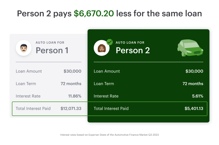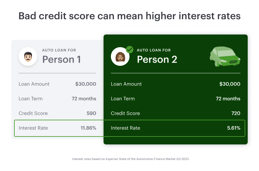 When you apply for a loan or a line of credit, lenders base your interest rate on several factors, including your credit score and debt-to-income ratio. Generally, the lower your credit score, the higher your interest rate. Maintaining a good FICO credit score (658 - 739) is key to securing a lower interest rate. A poor credit score can dramatically increase your interest rate. According to Experian’s State of the Automotive Finance Market Q3 2023, the average new car auto loan rate for subprime (501-600 credit score) borrowers was 11.86%. Here’s an example of just how much a bad credit score can affect your interest rates:
