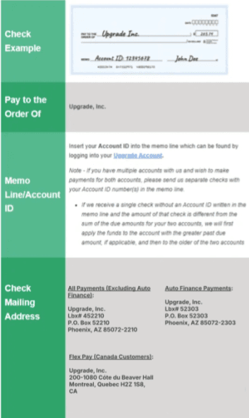 The quickest and most convenient way to make a payment is by downloading the Upgrade Mobile App on your phone or by logging into your Upgrade Account on your computer. Upgrade also accepts payments via check, but please be advised that the payment processing time frame can take up to 2-3 weeks.