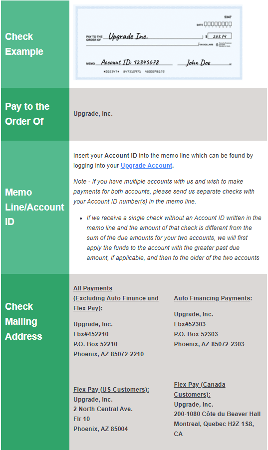 - Include the following information on your check:On the Pay to the order of line:Upgrade, Inc.On the Memo line:Your Account ID Number