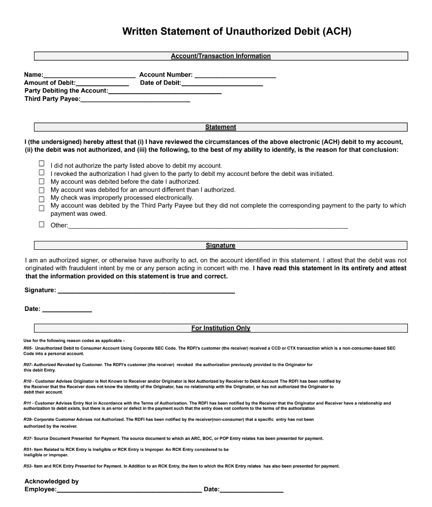 To ensure a timely and proper investigation of your claim, please complete and sign a Written Statement of Unauthorized Debit (WSUD) form (see form below) for each transaction you would like to dispute, and email the form(s) to us at depositsupport@upgrade.com.
